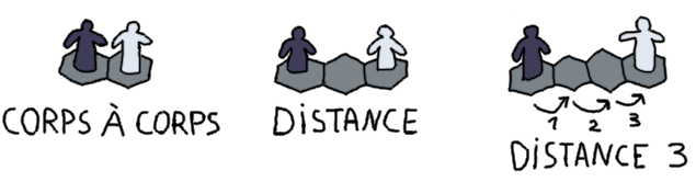 La condition Distance te demande d’être à une certaine distance minimum de ton adversaire. Par exemple, Distance 3 te demande d’être à 3 cases ou plus de ton adversaire .
